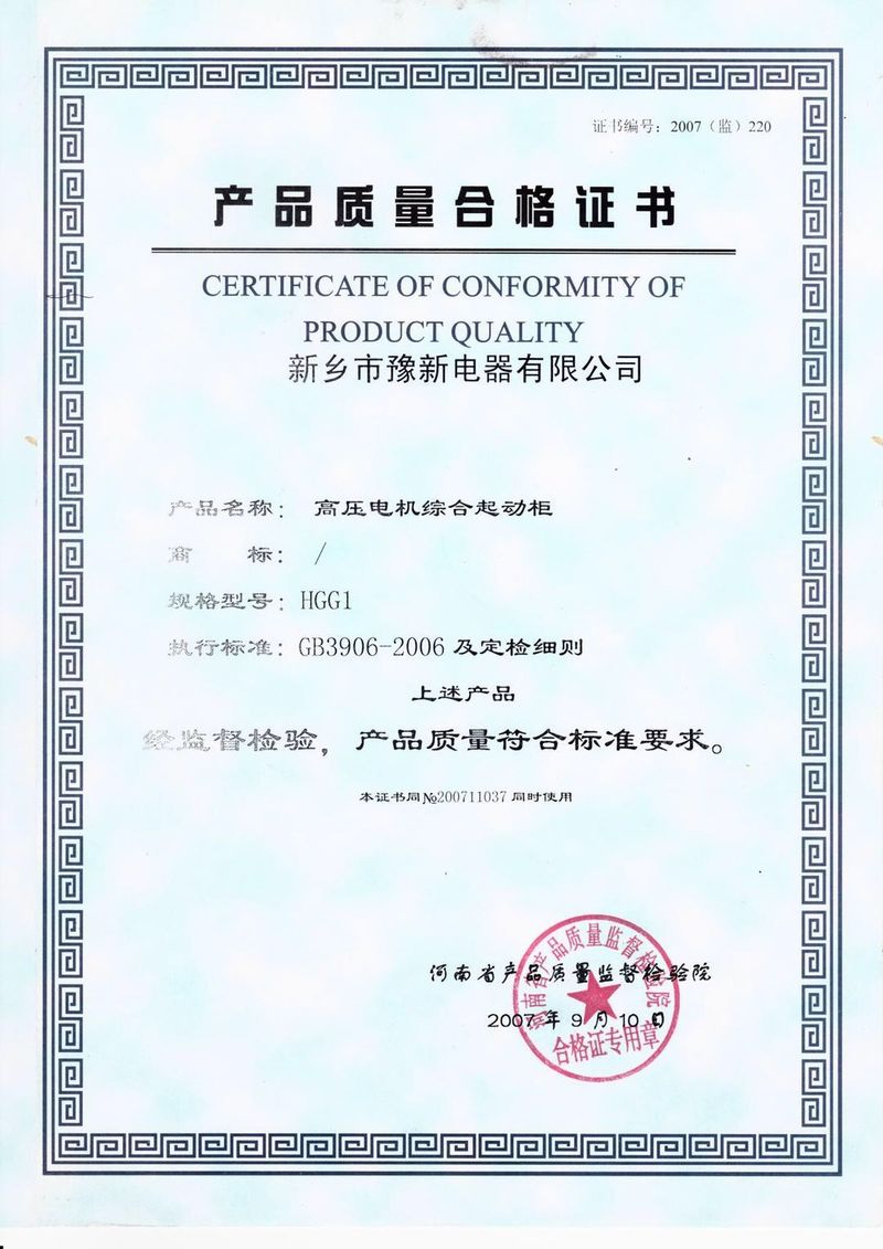 產(chǎn)品質(zhì)量合格證書