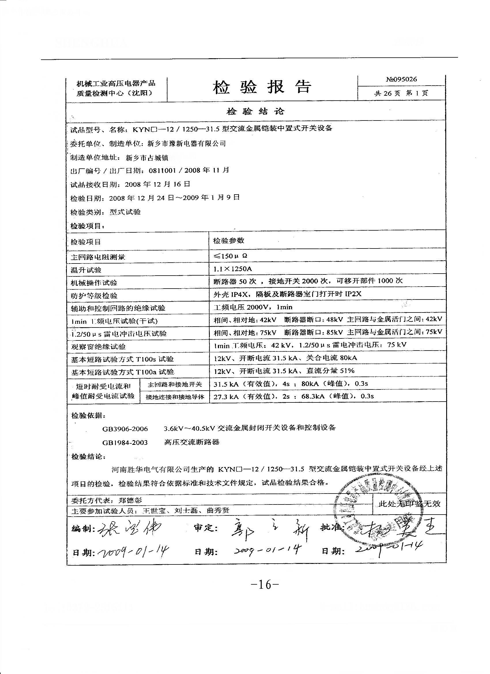 KYN28高壓開關(guān)柜檢測報(bào)告